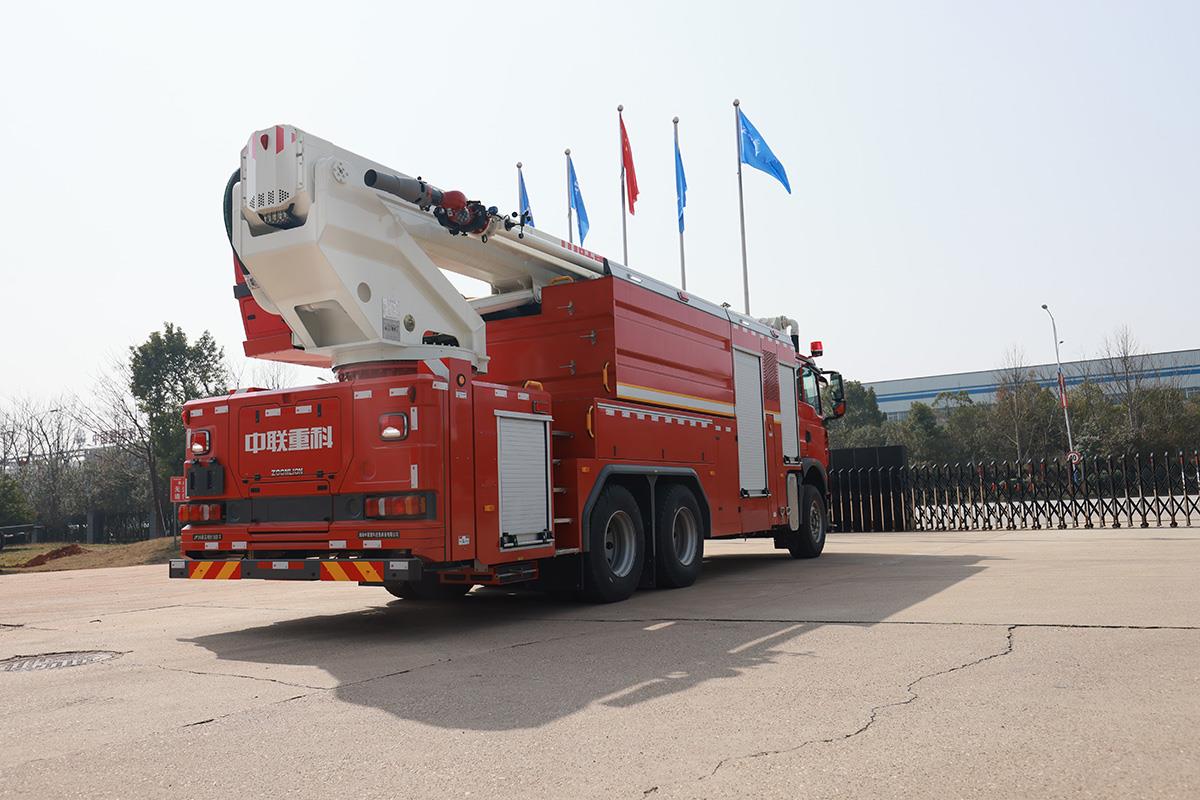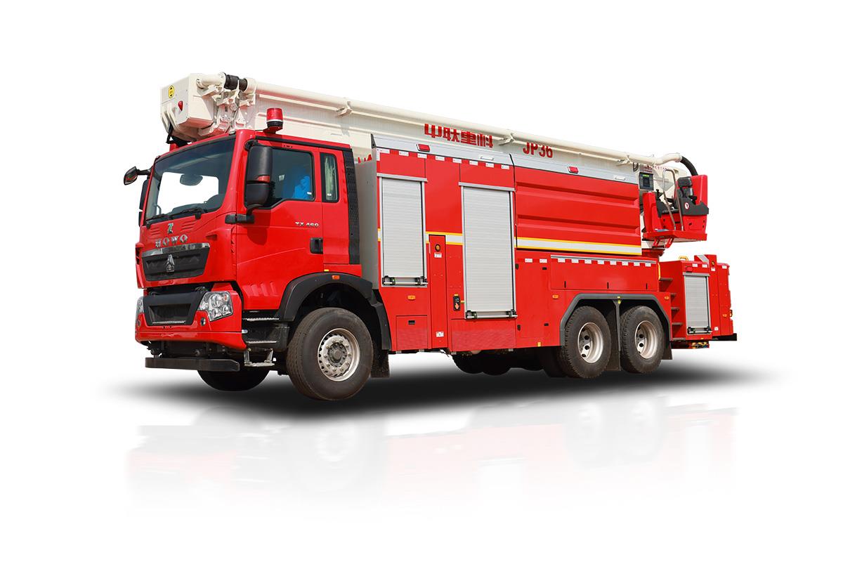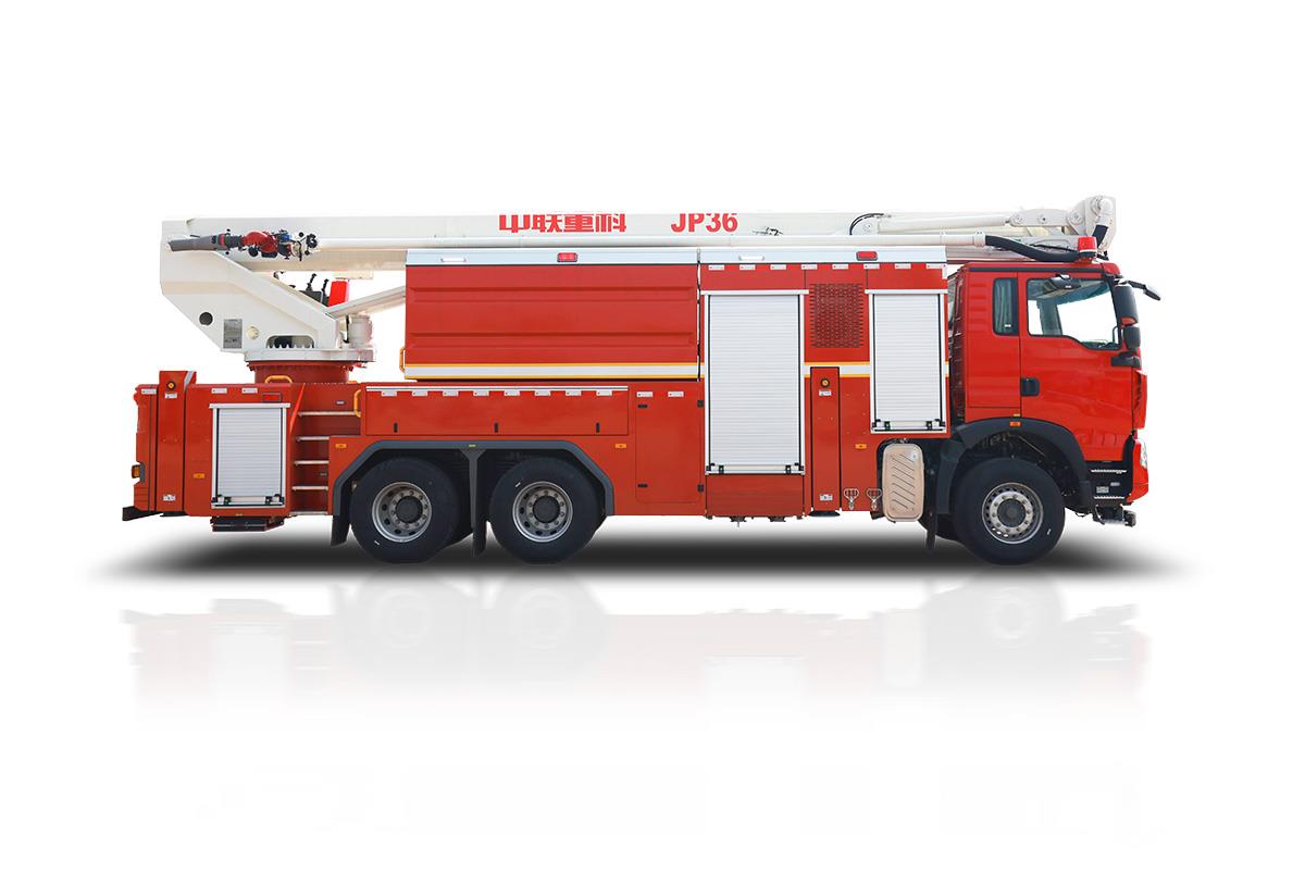 中联牌36米举高喷射消防车(以下简称高喷车)是一种消防高空灭火装备,主要用于城镇、工矿企业高层建筑以及石油、化工、油罐、仓库等高大建筑物的火灾扑救。该车选用重汽HOWO专用底盘改装,装备美国希尔RSD100型中低压消防泵,整车外形美观、动力强劲、操作方便、作战速度快、射程远、流量大。本高喷车可全方位回转,各机构性能均由液压驱动,操作简便灵活,消防实战灭火作业时展开迅速,运作平稳,安全可靠。本车带有水罐、消防泵,臂架顶端的消防炮射程远,流量大,即可打直流,又可喷雾,可以在距火源较远的位置独立完成救火作业,是当今世界上较理想的高空消防灭火装备。