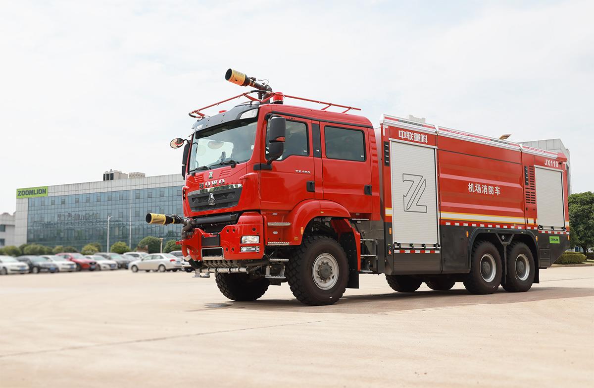 中联牌JX110A6型机场主力泡沫消防车,采用国内知名品牌6×6特种商用越野底盘改装,底盘动力强劲,搭载自动变速箱,加速快,车速高,救援更高效;消防水泵由独立专用大功率发动机驱动,行进中可随时开启消防系统灭火;配有大容量灭火剂罐,搭载智能灭火喷射系统,操作简单,在驾驶室内即可完成所有灭火救援操作,能快速扑救飞行器火灾,是各类机场必备的火灾救援主力装备。